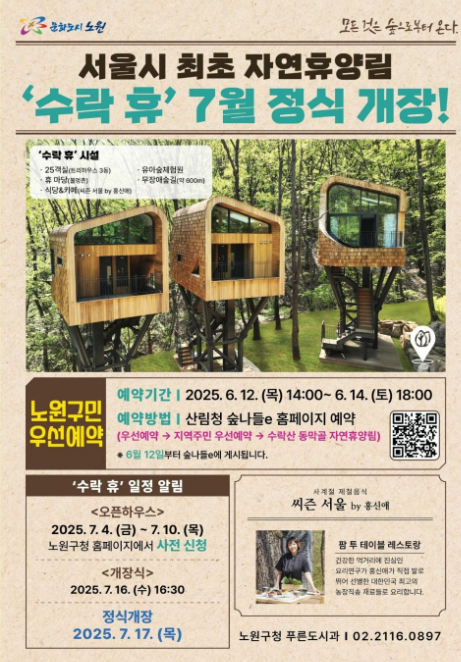 2025년 6월 12일부터 노원구민을 대상으로 우선 예약이 시작되었으며, 일반 예약은 6월 16일부터 진행됩니다. 이곳의 가장 큰 특징은 나무 위에 지어진 트리하우스 형태의 숙소로, 색다른 경험을 원하는 이들에게 인기가 높습니다.